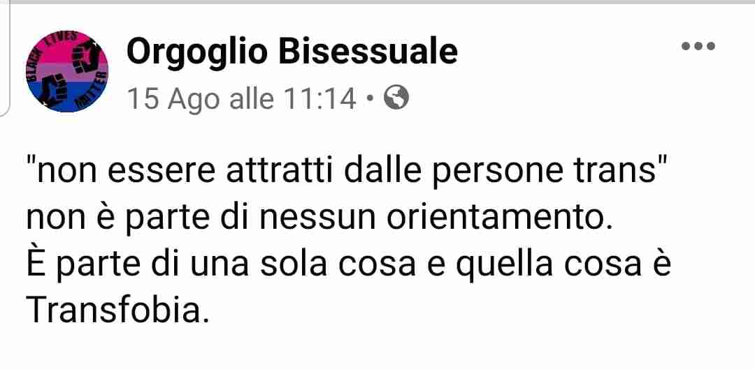 Ha fatto scalpore, nonché il giro del web, il meme fatto circolare dal profilo “Orgoglio bisessuale” secondo cui “non essere attratti dalle persone trans non è parte di nessun orientamento. È parte di una sola cosa e quella cosa è Transfobia”. Un passo avanti importante nella previsione del regime prossimo venturo: non è solo improprio (e vietato) essere contrario per qualsivoglia motivo a determinate logiche, lo sarà anche non essere attratti da certe alternative. A quanto pare, nell’anti-utopia prossima ventura, dovremo tutti farci periodicamente un giretto su un trans per dimostrare la “purezza” dei nostri intenti, oltre che l’assenza di ogni pregiudizio. E se rifiuteremo, col DDL Zan in vigore rischieremo dai 18 mesi di carcere in su, più svariate multe.