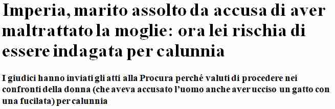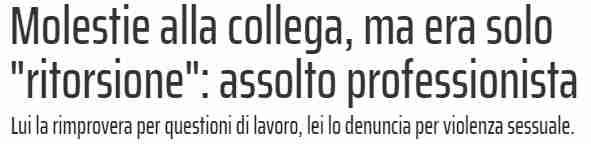 La colpa gravissima della Sergiacomi non è quella di aver detto una menzogna che infatti non ha detto, ma di aver detto una verità scomoda, osando quindi toccare un tasto che non deve essere toccato. Tuttavia la Presidente di Parità, travolta da tante proteste, ha voluto (o dovuto?) fare un passo indietro nonostante la sacrosanta verità contenuta nelle sue dichiarazioni. «Sono stata fraintesa, una frase estrapolata da un discorso complessivo da giurista mi sembra un attacco personale. Il concetto che ho espresso è, attenzione non denunciate senza prove perché altrimenti le denunce saranno considerate false e archiviate. Se le attiviste del Centro Veneto Progetti Donna avevano dubbi, potevano chiedermi spiegazioni. Così è un’azione strumentale». Infatti. Le spiegazioni si danno in privato quindi hanno un profilo basso, invece è molto più produttiva la strategia del clamore mediatico: sia chiaro, chiunque si azzardi a parlare di false accuse verrà sbranato. Believe women. C’è poi un tentativo, anche abbastanza goffo, di ridimensionare la portata delle dichiarazioni: donne, dovete documentare bene le denunce altrimenti c’è il rischio che gli inquirenti archivino poiché non riescono a vedere gli estremi di reato. No, assolutamente no. Il fulcro del problema non sta nelle denunce scarsamente documentate ma nelle denunce false, sfacciatamente false, vergognosamente false, totalmente costruite sulle menzogne e inventate dalla prima all’ultima riga. Denunce fondate sul nulla che a volte costringono il PM a inviare gli atti in Procura per procedere contro la querelante. Per intenderci, ecco una sintetica selezione. Per chiunque volesse approfondire, abbiamo in archivio articoli originali a centinaia (clicca per ingrandire le immagini):