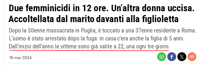 Continua la solita informazione deviata e deviante, che in occasione di un “femminicidio” strilla «è la Xesima vittima dall’inizio dell’anno!», lasciando intendere che tutte le donne uccise siano classificabili come “femminicidi”, quindi delitti generati dalla gelosia morbosa, dal possesso, dalla mancata accettazione della libertà femminile, dalla prevaricazione di genere. I numeri reali sono questi: 10 vittime di “femminicidio”, 11 contando l’episodio di Taurisano e quello di Roma, dall’inizio dell’anno. La narrazione delirante però ne spaccia più del doppio. Informazione-spazzatura, figlia del delirio ideologico e della disonestà intellettuale.