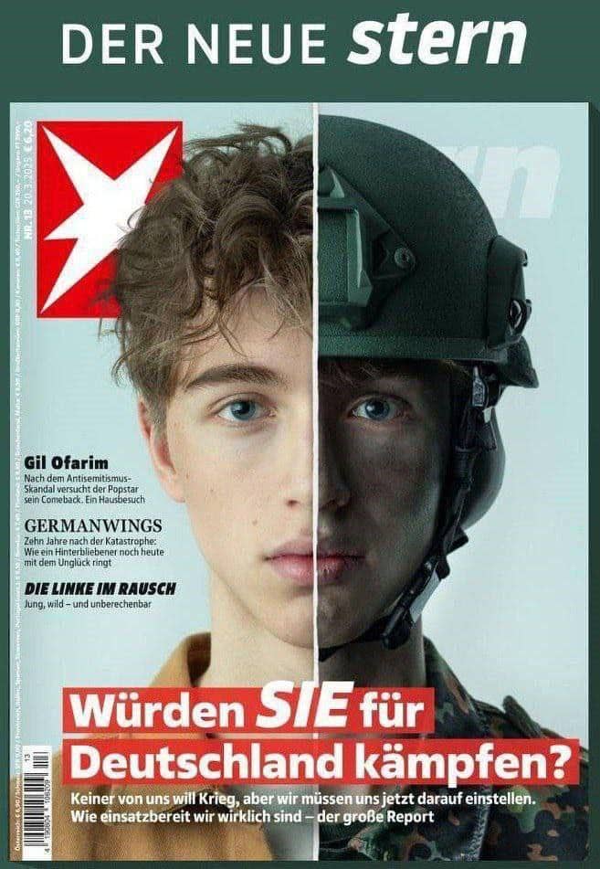 Tutto si tiene, ben collegato da un filo comune, ossia la criminalizzazione e mostrificazione della figura maschile, la messa all’indice della sua caratteristica biologica peculiare: la forza e l’uso opportunista che l’uomo ne può fare tramite la violenza. Tutto bello, tutto molto femminista, ma… cosa accade ora che in molti in Europa ritengono che ci si debba armare fino ai denti per difenderci dall’aggressione della Russia e degli Stati Uniti, questi ultimi non più amici né alleati da quando c’è Donald Trump? Accade che “intellettuali” di vario genere si mettono a parlare e a scrivere sui mass-media usando espressioni che sarebbero suonate bene sulle labbra del Mussolini interventista del 1914. Umberto Galimberti su La7: “con la pace si diventa migliori, ma si diventa anche imbelli. La pace intorpidisce anche la dimensione guerriera, intesa in senso nobile”. Antonio Scurati su Repubblica: “il vero problema dell’Europa è la mancanza di guerrieri, la svanita combattività dei popoli. L’Europa deve trovare lo spirito combattivo e il senso della lotta”. E che non si tratti di esternazioni di gente che straparla, ma una strategia comunicativa europea coordinata, lo dimostra anche questa agghiacciante copertina dell’ultimo numero del periodico tedesco “Die Stern”, con il titolo: “Andresti a combattere per la Germania? Nessuno di noi vuole la guerra, ma dobbiamo prepararci adesso”.